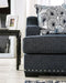 SONORA Loveseat, Dark Navy, 71"L X 44"W X 40"H, 100lbs. Sit back and enjoy the tried-and-true classic appearance of this loveseat in your living. Plush T-seat cushions and loose pillow backs feature smooth curves that create a truly inviting appeal that enhances this loveseat, without detracting from the comfort it provides: the soft fabric and spacious wide armrests. Each piece is supported by tapered block legs visually obscured by the bright nickel polished nailheads that line the bottom edge of the frame. This loveseat mingles uniquely old fashioned themes with more modern luxurious comforts.