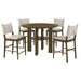 This counter-height dining set blends transitional style with practical design, creating a warm and inviting space for casual dining. The set includes a round counter-height table with a rich brown finish, angular legs, and an open lower shelf for added functionality. Complementing the table are matching counter-height chairs upholstered in light tan fabric with foam-padded seats. Each chair features a wrapped backrest with unique brown tie accents for a sophisticated touch. Crafted from durable rubberwood, engineered wood, and fabric, this set is perfect for everyday dining or entertaining. Key Features: • Counter-height dining set with a round table and matching upholstered chairs • Table features a rich brown finish, angular legs, and an open lower shelf for storage • Chairs upholstered in light tan fabric with foam-padded seats for comfort • Wrapped backrests with brown tie accents add a stylish, sophisticated detail • Constructed from rubberwood, engineered wood, and fabric for lasting durability • Perfect for transitional or modern dining spaces with a warm and refined aesthetic