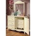 A camel-back design with vertical grooves gives charm to this set. The low-post bed shares the same design as the mirror, and like the bed, the rest of the case goods are also finished in cream. The suggested metal bed frame works perfectly with the bed in supporting the mattress.