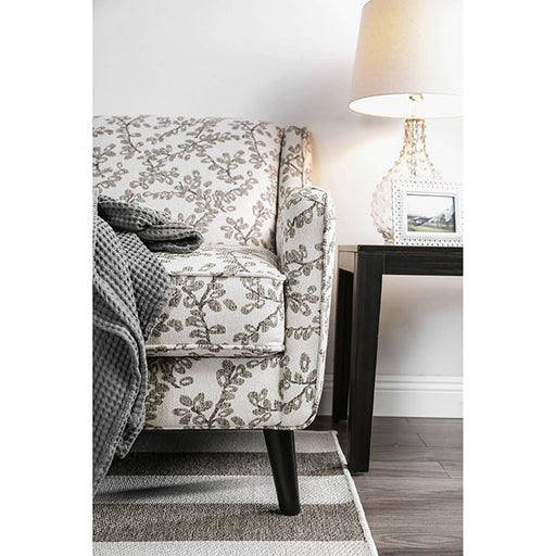 Dorset Light Gray Sofa, 86"L X 41"W X 35"H, 130lbs. This stylish sofa set enjoys the use of muted tones and floral patterns to give your living room a toned down style that is still filled with character. The Tufted fitted back cushions look playful against their contrasting throws pillows. The accent chairs dazzle while being restrained enough to not overtake the room. Features: Contemporary Blue Woven Fabric, Solid Wood Frame Sloped Arms Tufted Cushions Fitted Back Pillows Middle Support Leg Pillows Included Sun & Stain Resistant Revolution Fabric