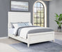 Refresh the look and feel of your bedroom with the inviting character of a modern upholstered bed. The bed features a wood frame in a distressed white finish that highlights its grain details. The headboard is a squared design complete with a padded panel upholstered in white for a monochromatic effect that's clean and contemporary. A low footboard completes the look and creates an open, inviting profile for your bedroom.